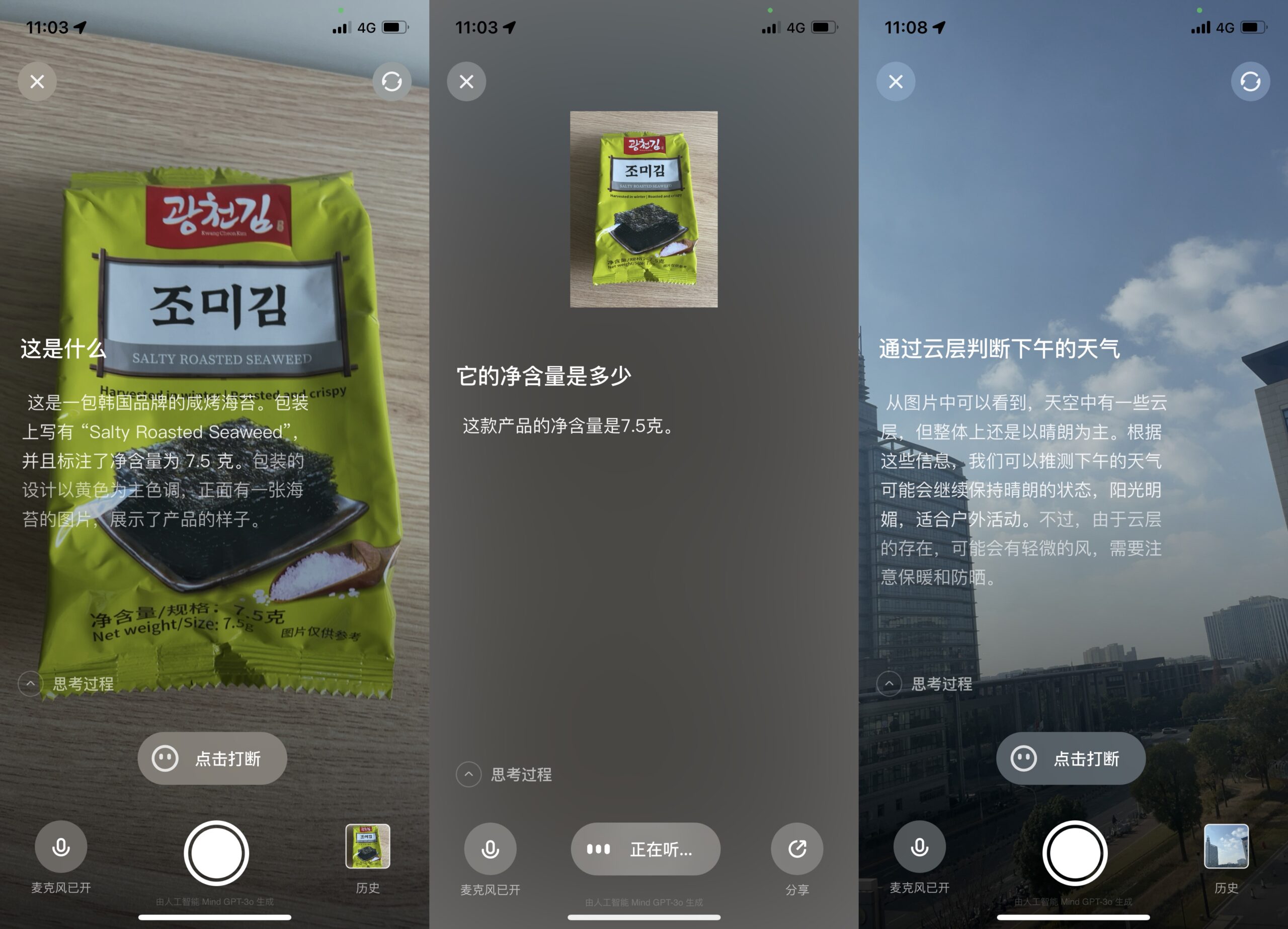 点击主页面左下方的摄像机按钮,就能敞开抱负同学 App 的视觉感知才能,可向其问询预览框内的物品内容信息,支撑实时画面问询和拍照问询。此功用页面最下方显现,其回复内容由人工智能 Mind GPT-3o 生成。